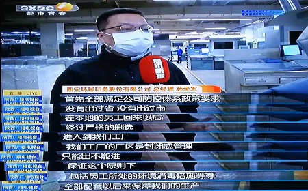 2020年2月10日早上,陜西電視臺都市快報欄目對環(huán)球印務(wù)股份有限公司進(jìn)行了探訪,主要圍繞復(fù)工復(fù)產(chǎn)情況下,公司防疫聯(lián)控措施開展情況進(jìn)行了解。公司總經(jīng)理孫學(xué)軍先生分別從四個方面對公司疫情防控工作進(jìn)行了詳細(xì)介紹。一是嚴(yán)格落實返崗信息登記。實行一人一檔,準(zhǔn)確掌握返崗員工和家庭成員健康狀況。二是嚴(yán)格落實日常防控措施